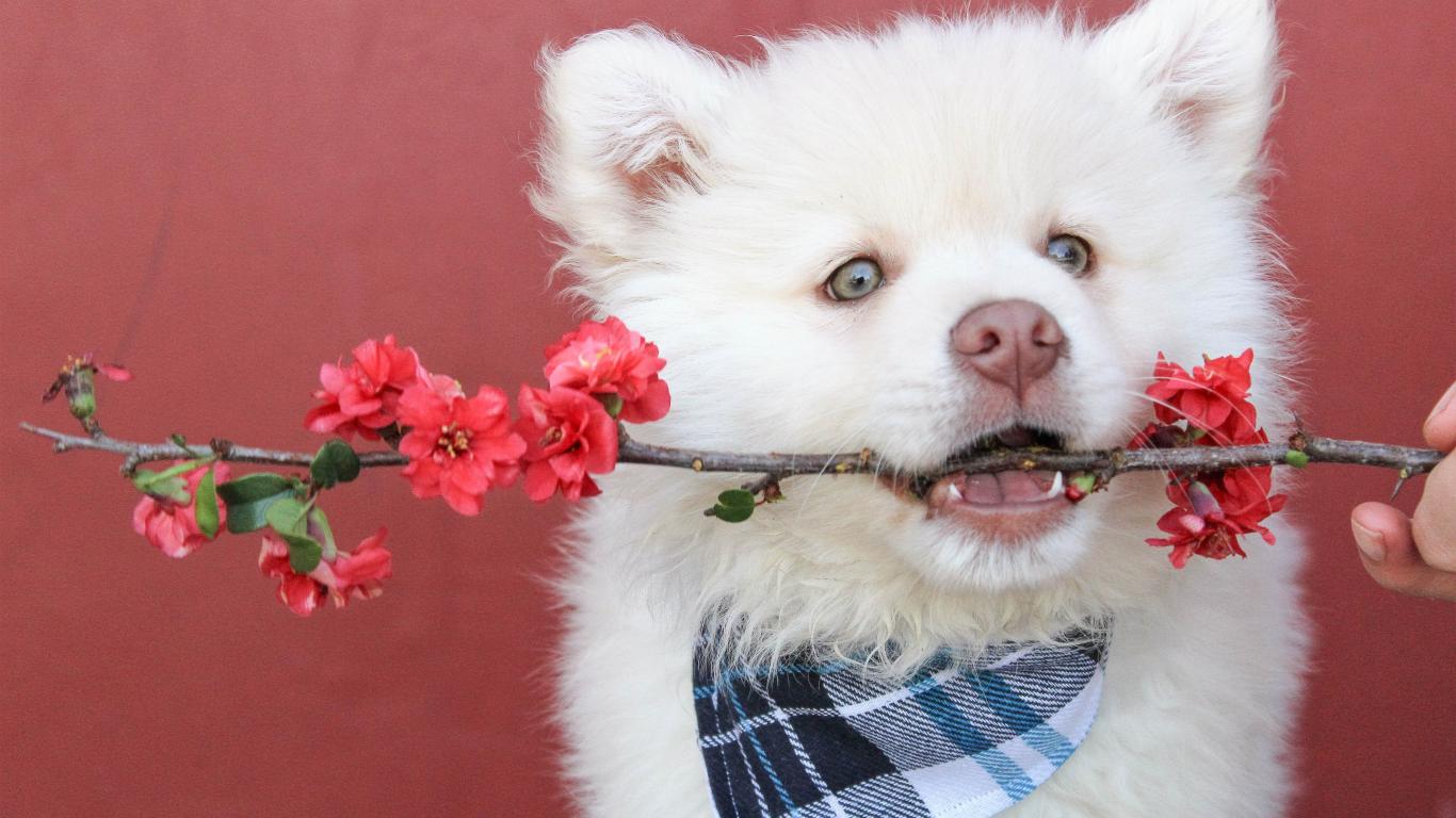 Wallpaper Samoyed husky puppy with a branch in his teeth