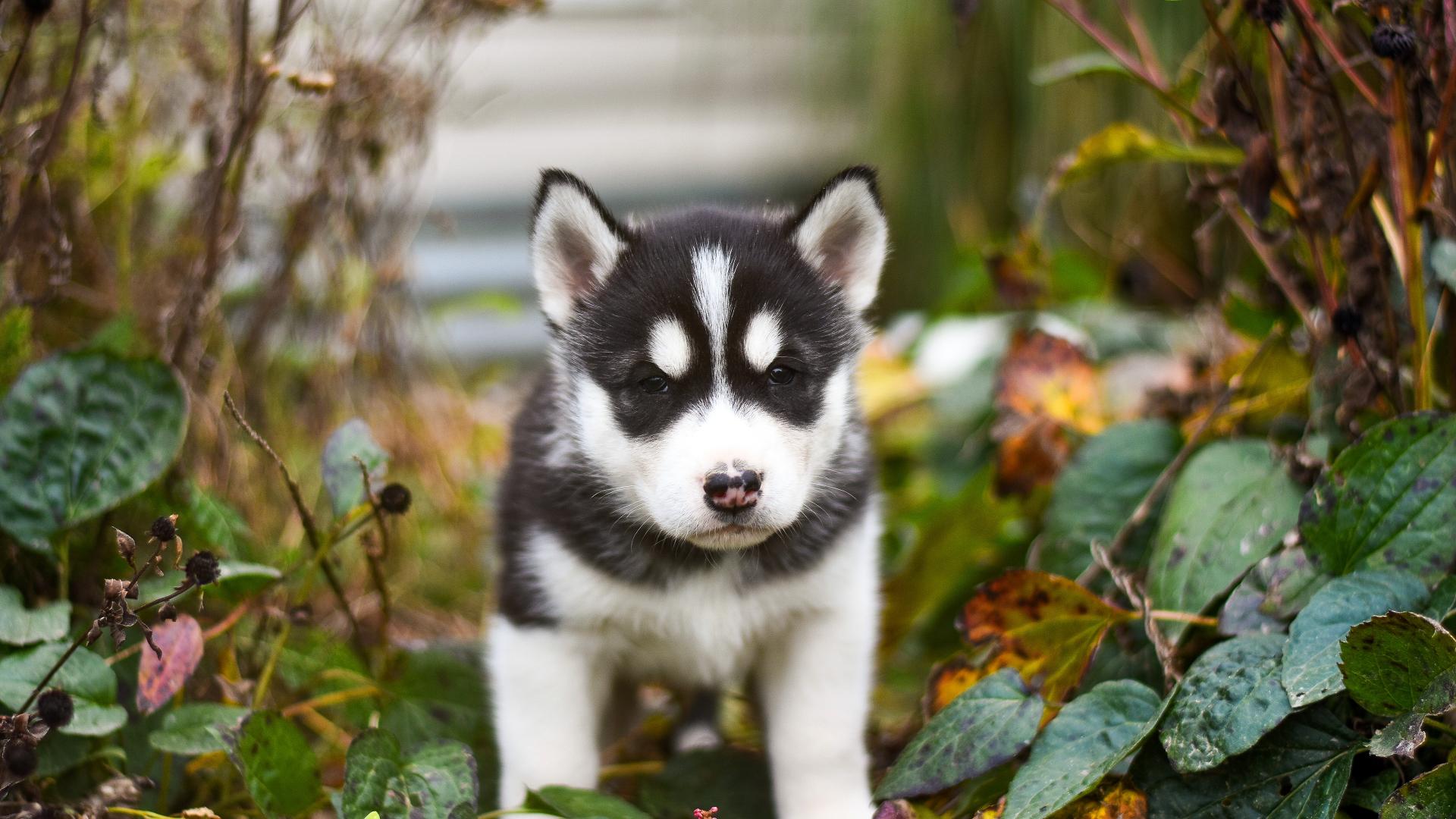 » Wallpaper Little husky puppy in green foliage