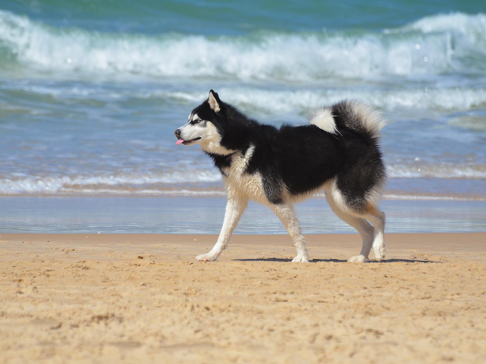 Wallpaper Husky dog running on the sand on the beach