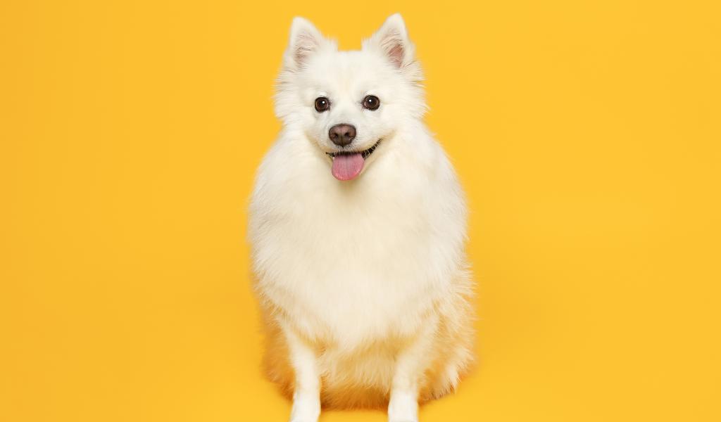 Wallpaper White fluffy spitz on a yellow background