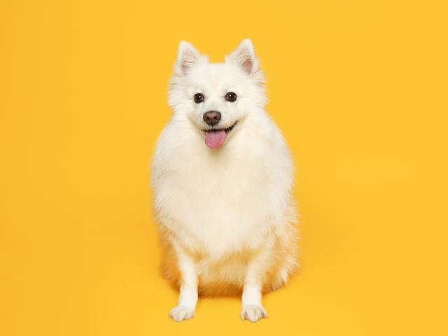 Wallpaper White fluffy spitz on a yellow background
