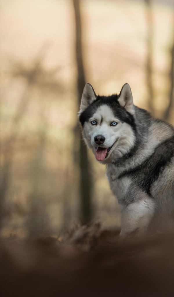 Wallpaper Blue-eyed husky with his tongue hanging out in the forest