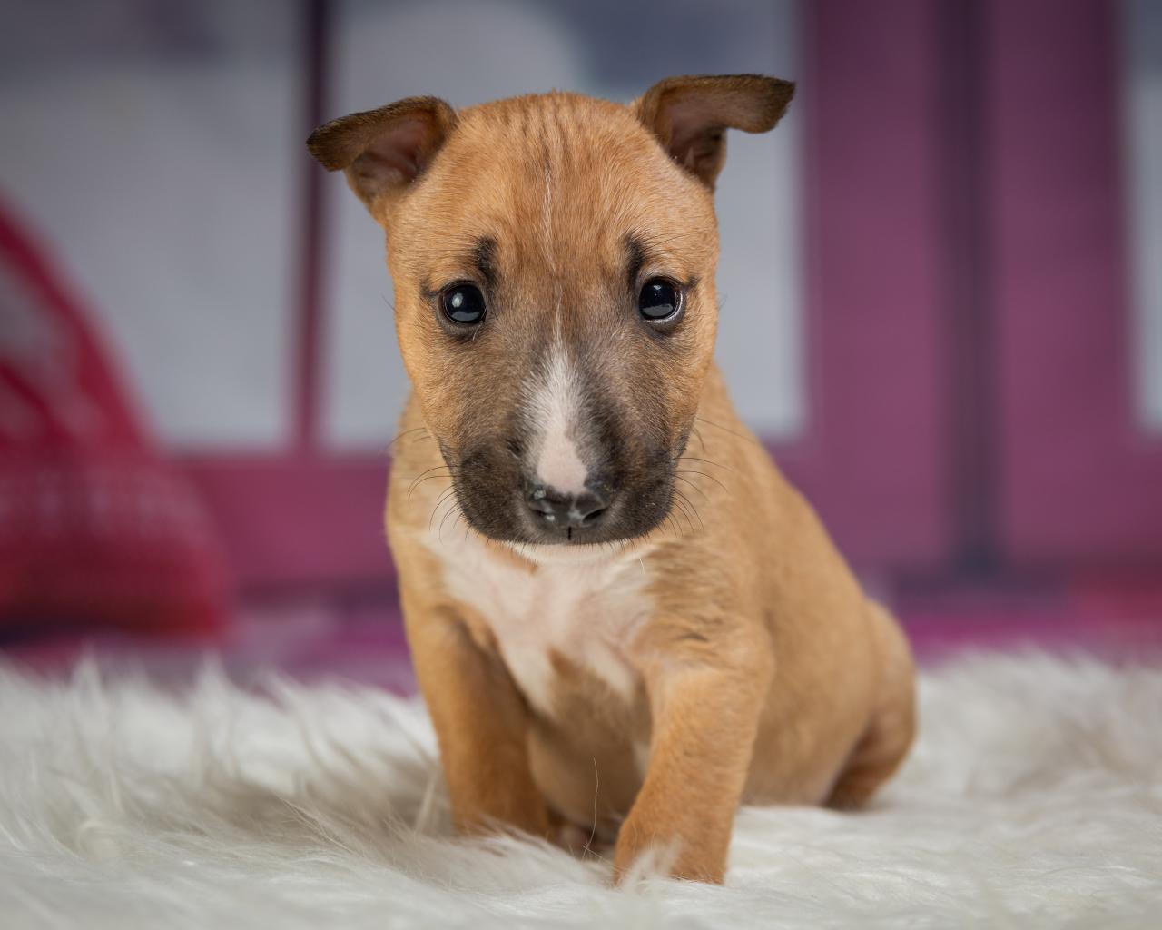 Wallpaper Little funny puppy sits on a fur bed