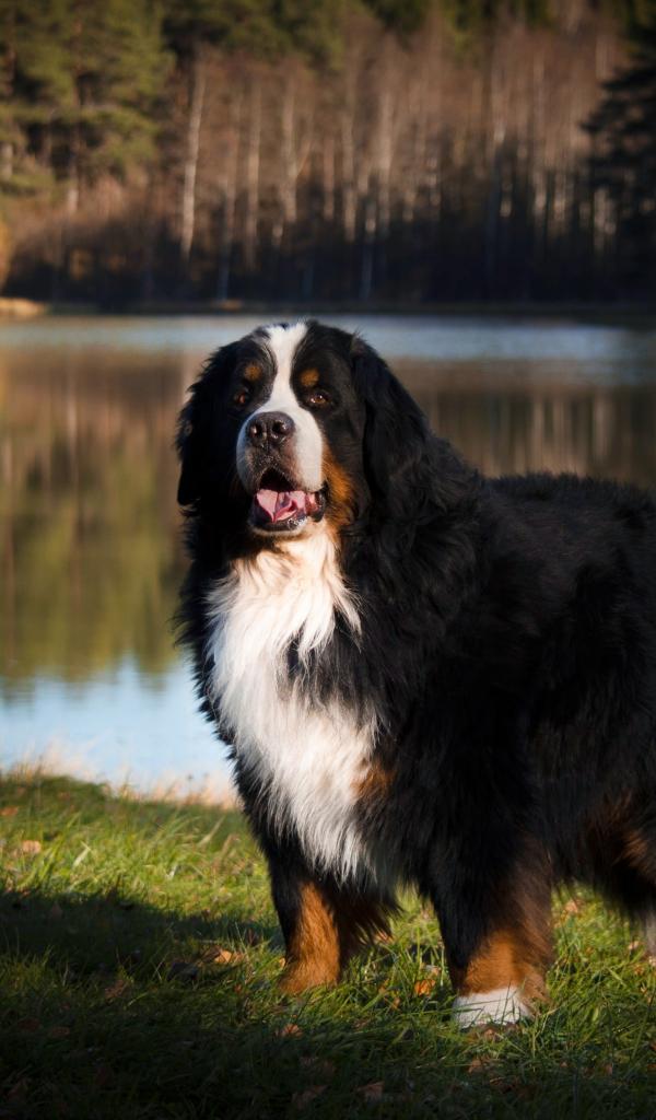 Wallpaper Bernese Mountain Dog on green grass by the water