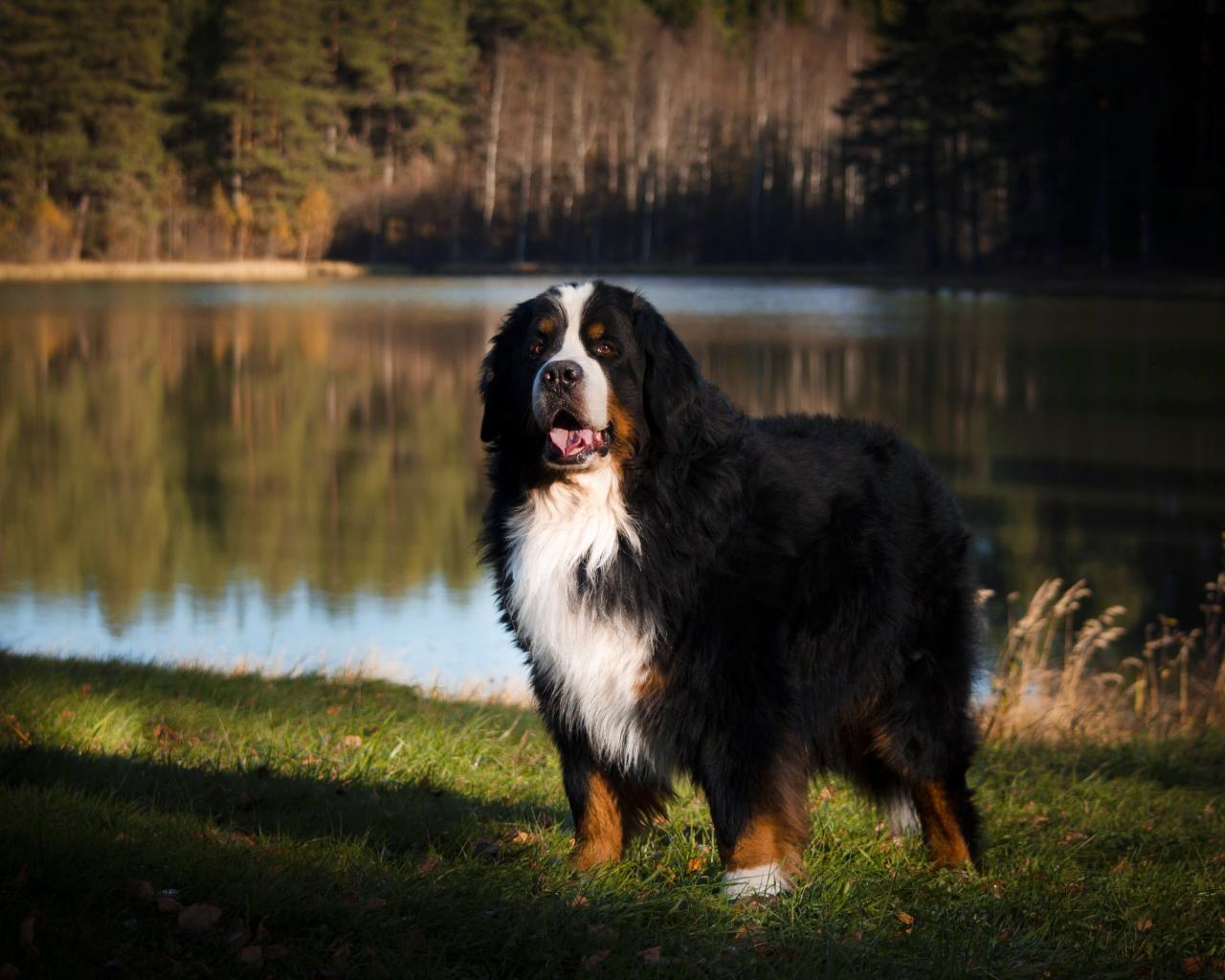 Wallpaper Bernese Mountain Dog on green grass by the water