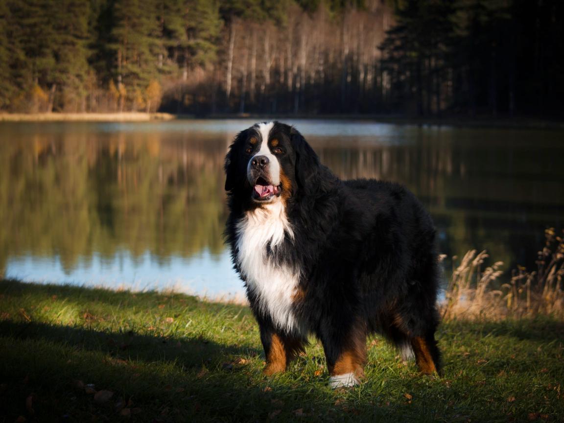 Wallpaper Bernese Mountain Dog on green grass by the water