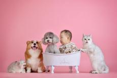 Wallpaper Two purebred dogs and two cats on a pink background