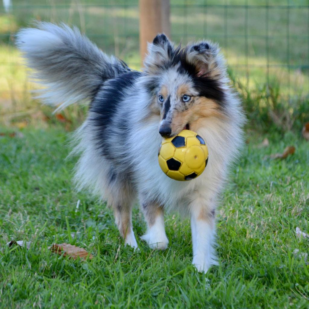 Wallpaper Sheltie with a ball in her teeth on the grass