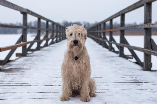 Wallpaper Fluffy dog sits on a snow-covered bridge