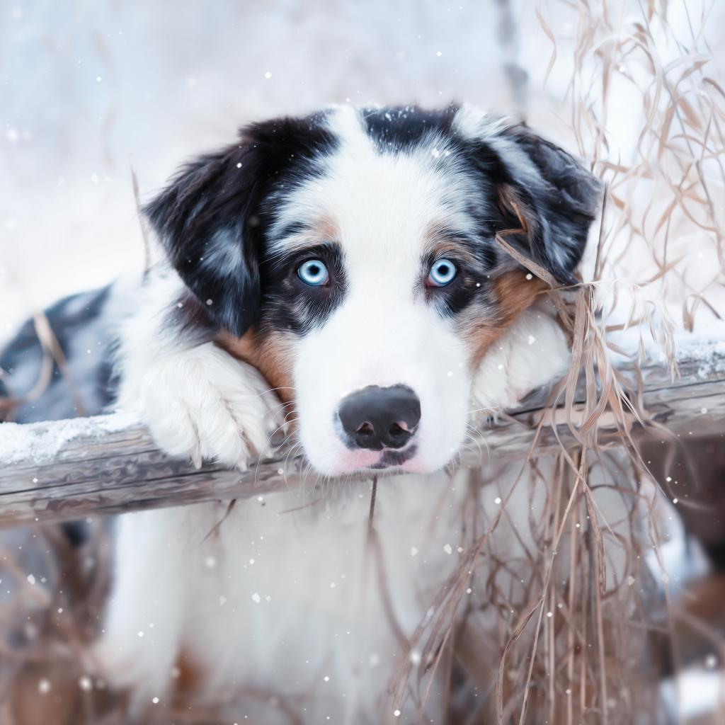 Wallpaper Australian Shepherd with blue eyes at the fence