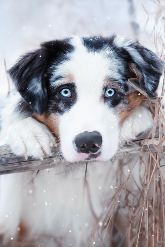 Wallpaper Australian Shepherd with blue eyes at the fence