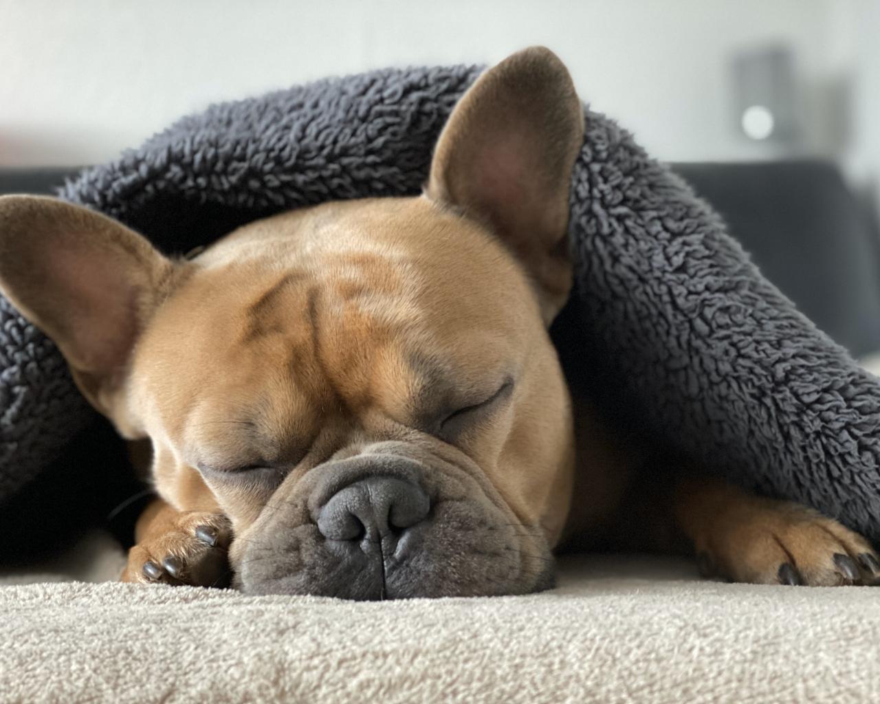 Wallpaper Little french bulldog sleeping under a blanket