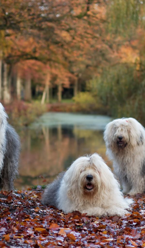 Wallpaper Three Bobtail dogs by a tree with fallen leaves