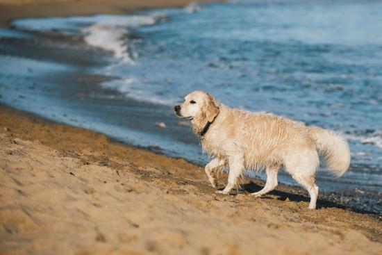 Wallpaper Golden retriever walks on the sand by the water
