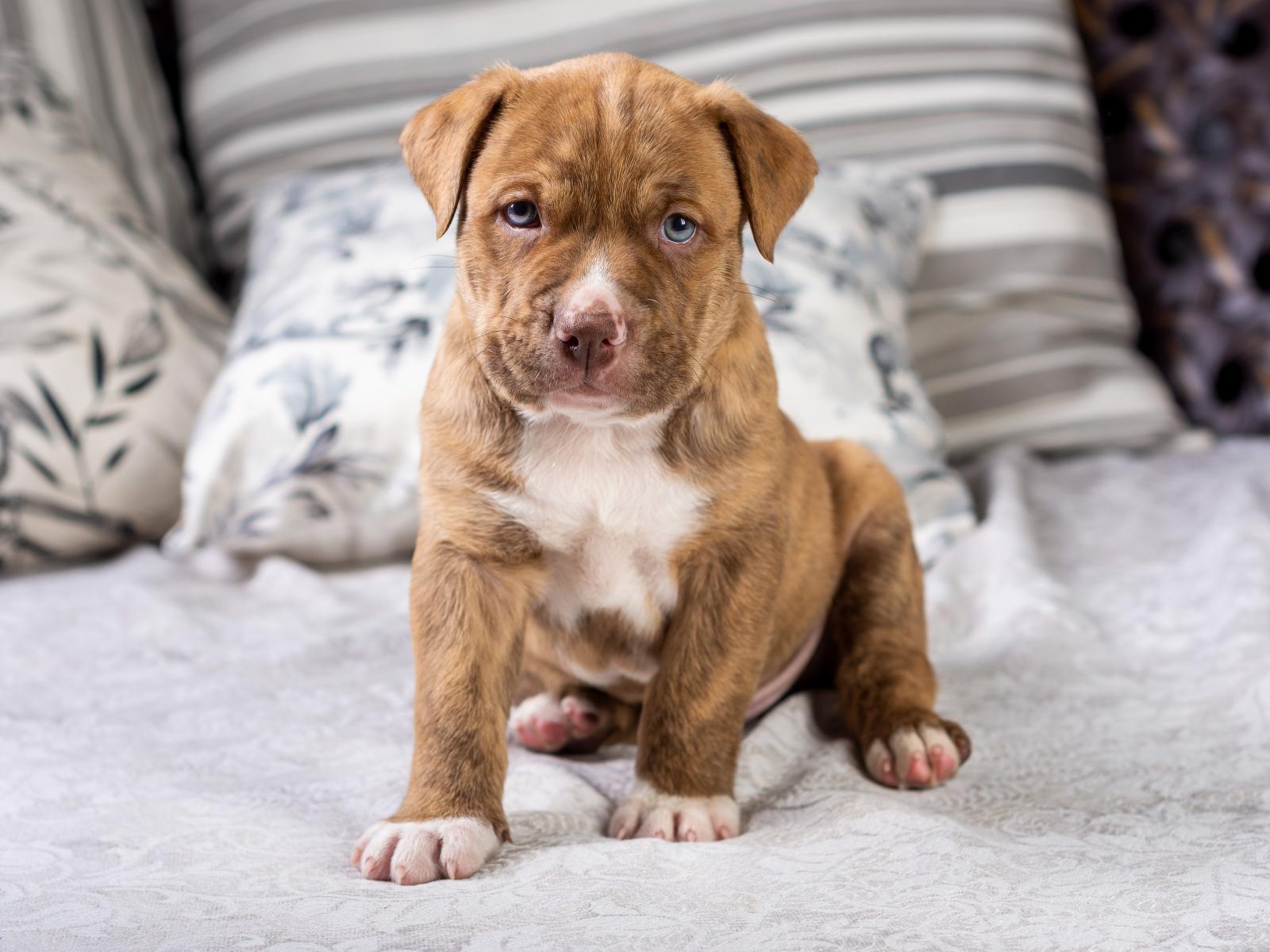 » Wallpaper Little staff puppy on the bed