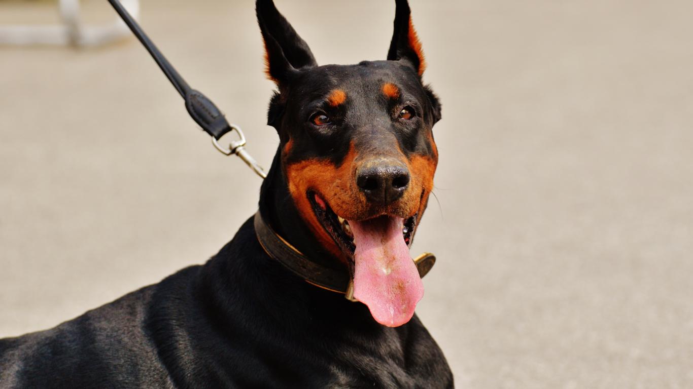Wallpaper Doberman pinscher with protruding tongue on a leash
