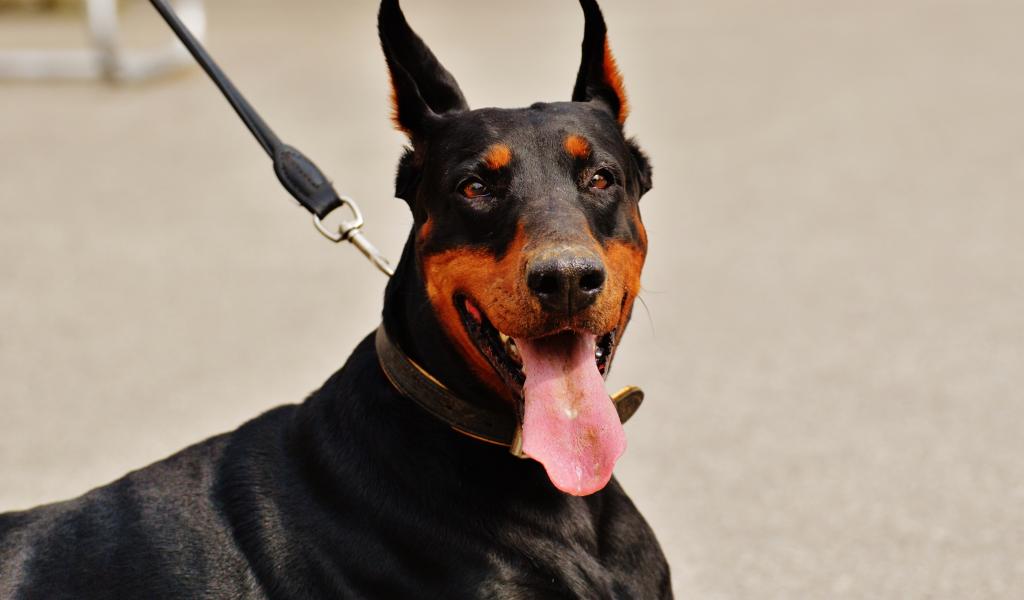 Wallpaper Doberman pinscher with protruding tongue on a leash