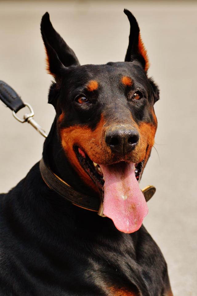 Wallpaper Doberman pinscher with protruding tongue on a leash