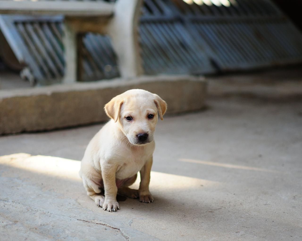 Wallpaper Little sad golden retriever puppy sitting on the ground