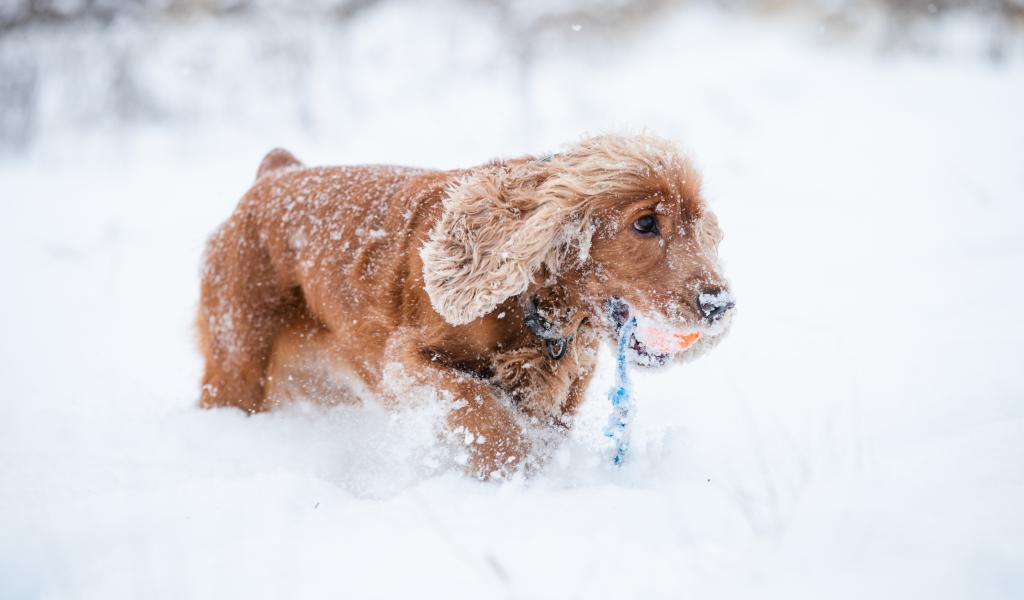 Wallpaper Spaniel with a wet nose and stuck out languages walks in purple colors