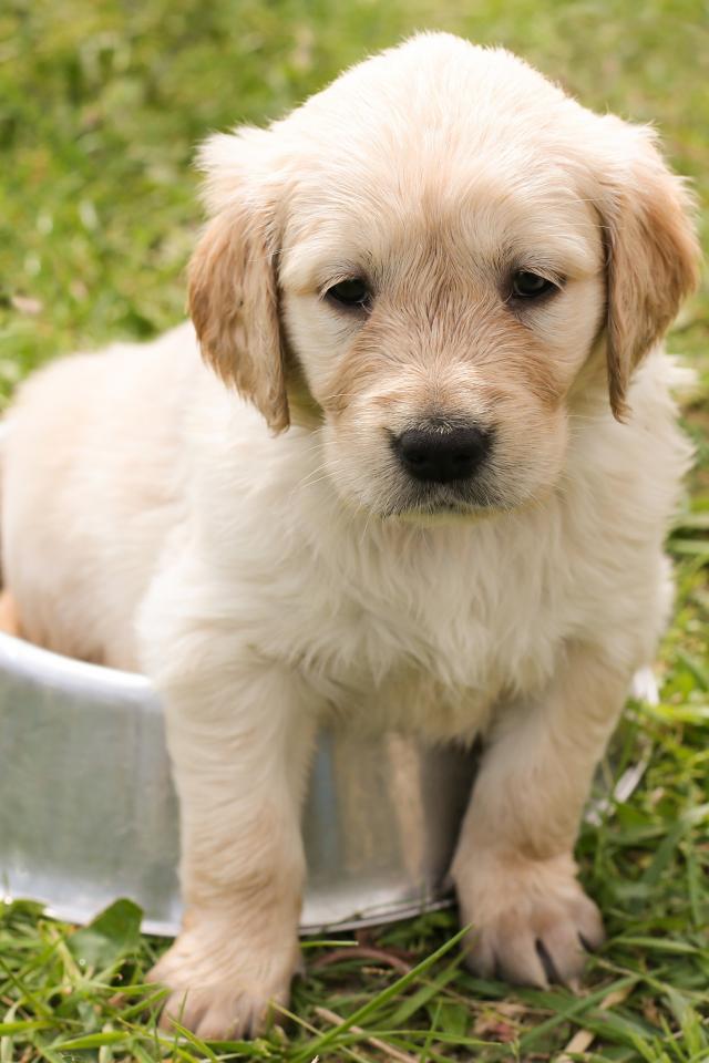 Wallpaper Golden Retriever puppy sitting in a bowl
