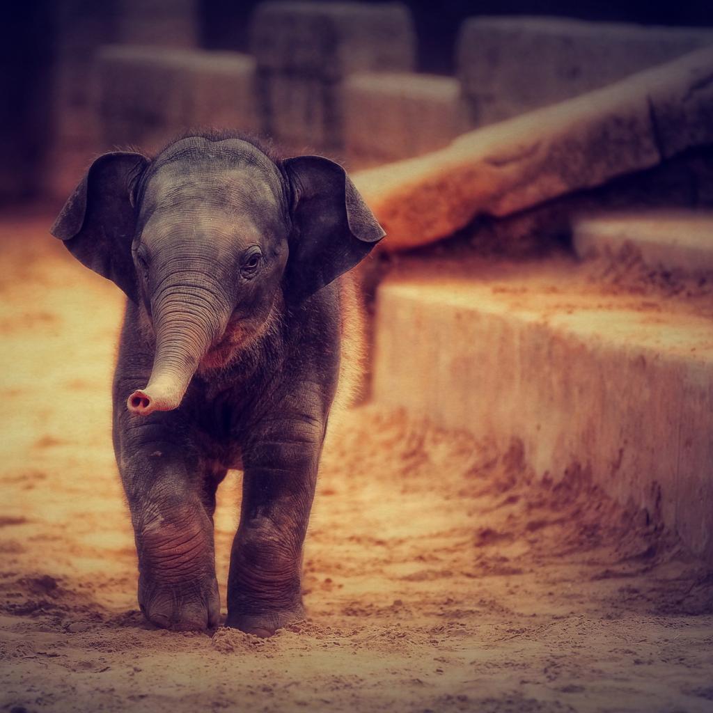 Wallpaper Little gray baby elephant walking in the sand