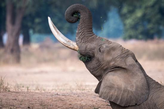 Wallpaper Gray Elephant with sharp tusks eats grass