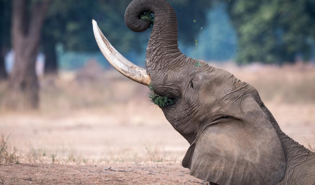 Wallpaper Gray Elephant with sharp tusks eats grass