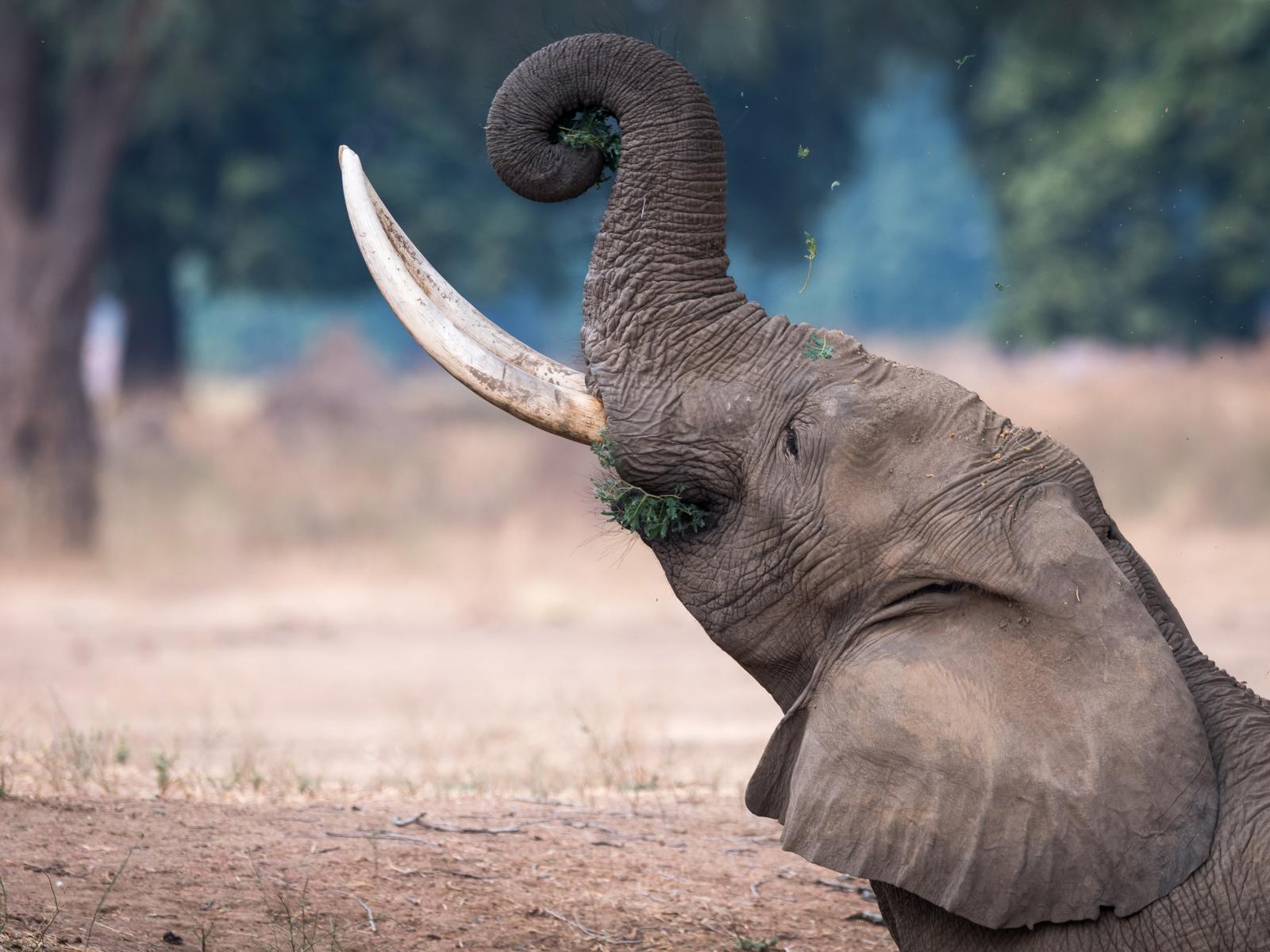 Wallpaper Gray Elephant with sharp tusks eats grass