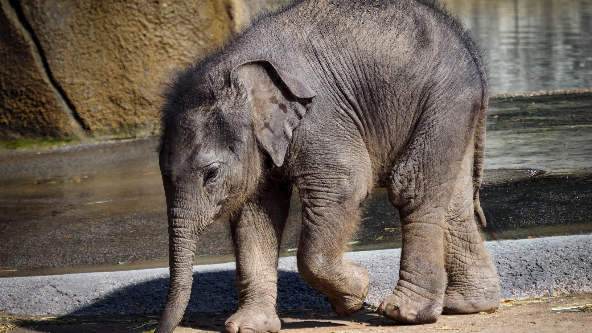 Wallpaper Little elephant at the zoo by the water
