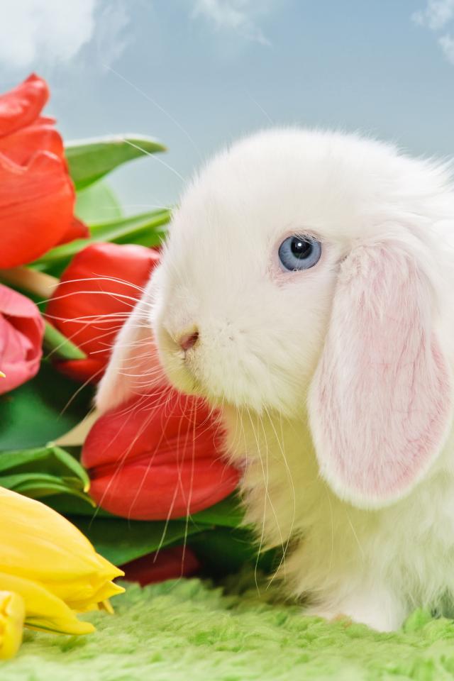 Wallpaper White blue-eyed rabbit with a bouquet of tulips