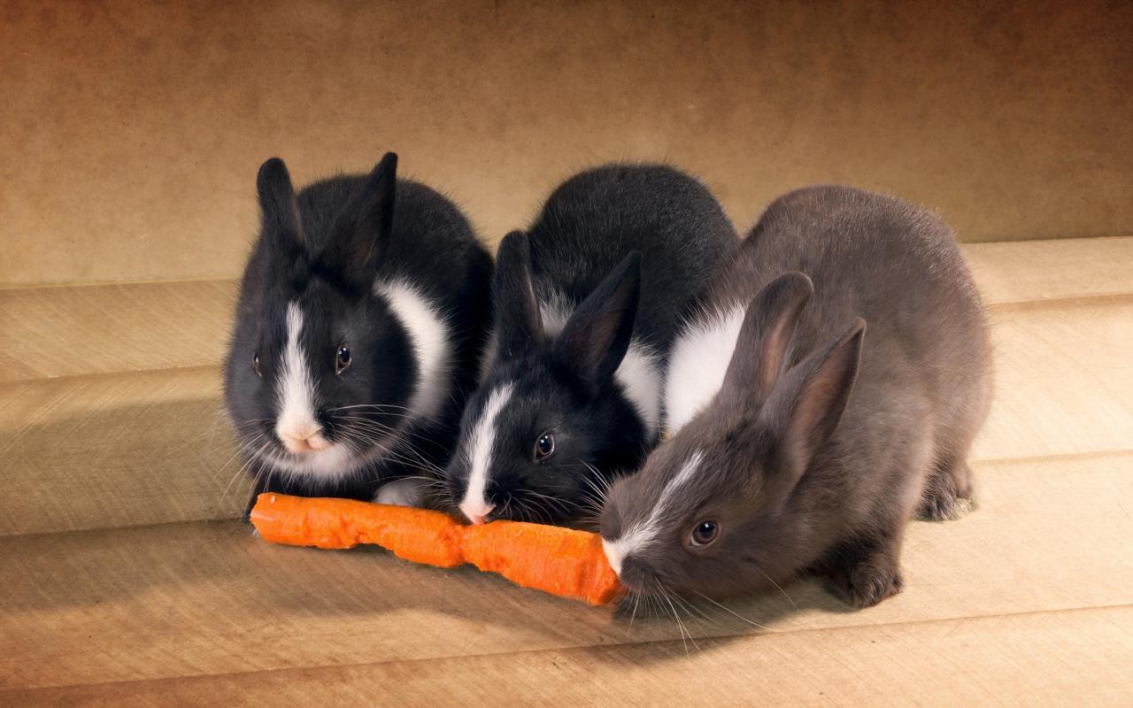 Wallpaper Three cute ornamental rabbits gnaw carrots