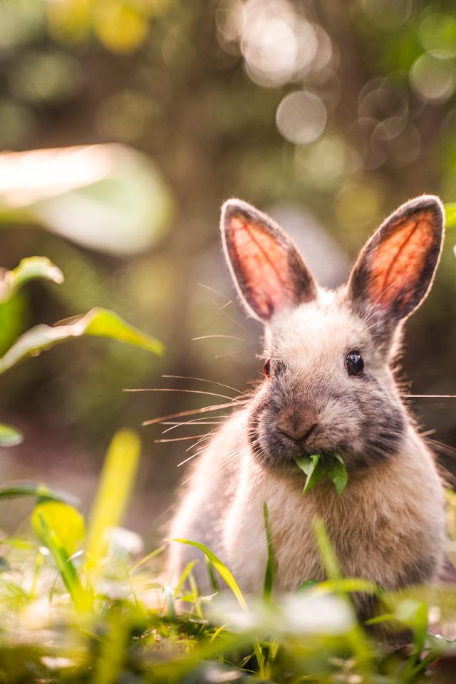 Wallpaper Gray rabbit gnaws green leaves