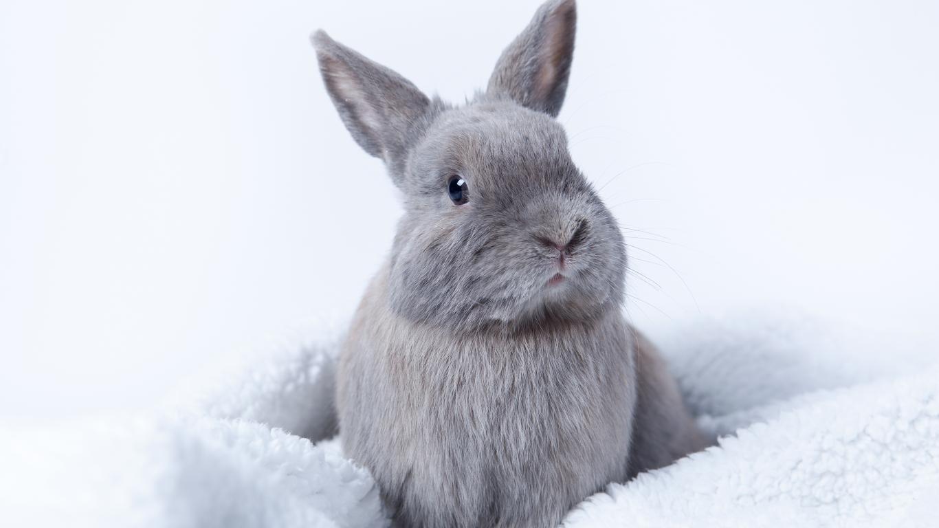 Wallpaper Gray decorative rabbit sits on a soft bedspread.