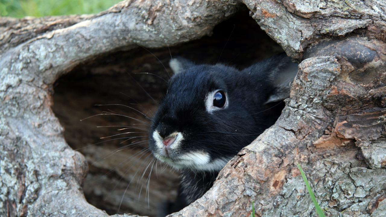 Wallpaper Scared black rabbit sitting in a burrow of wood
