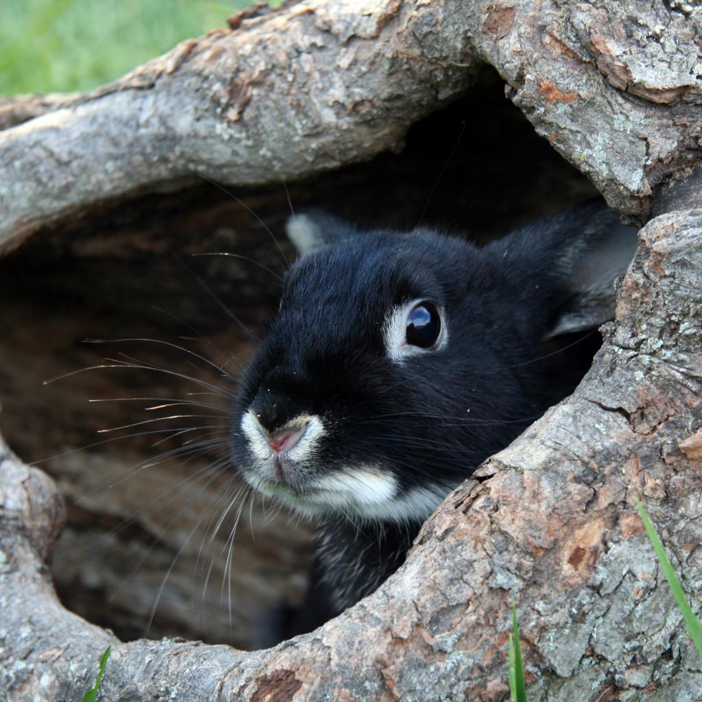 Wallpaper Scared black rabbit sitting in a burrow of wood