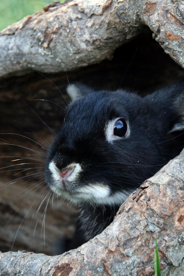 Wallpaper Scared black rabbit sitting in a burrow of wood