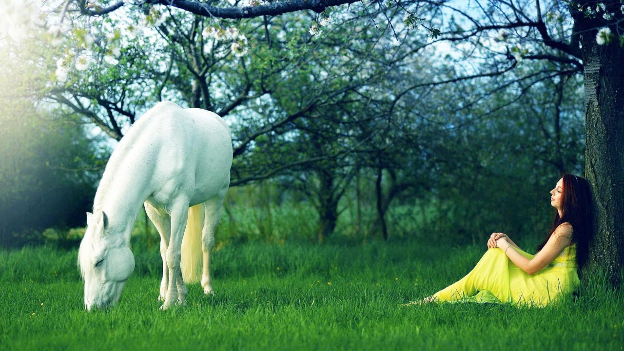 Wallpaper White horse and the girl in a yellow dress