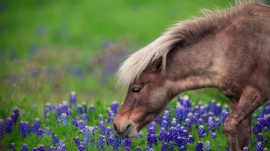 Wallpaper A brown horse walks the field with blue flowers