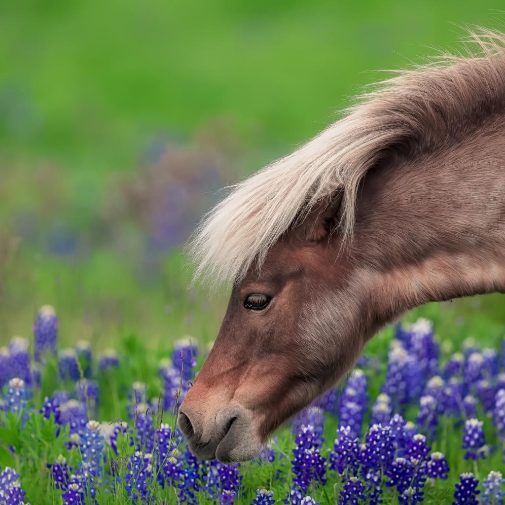 Wallpaper A brown horse walks the field with blue flowers