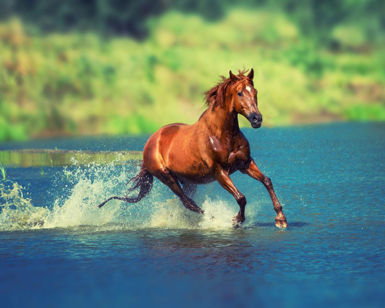 Wallpaper A brown horse jumps on the water