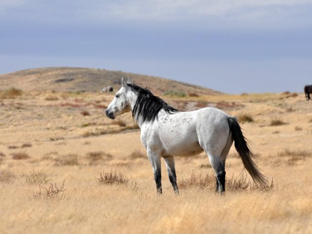 Wallpaper White horse with black mane grazing on dry grass