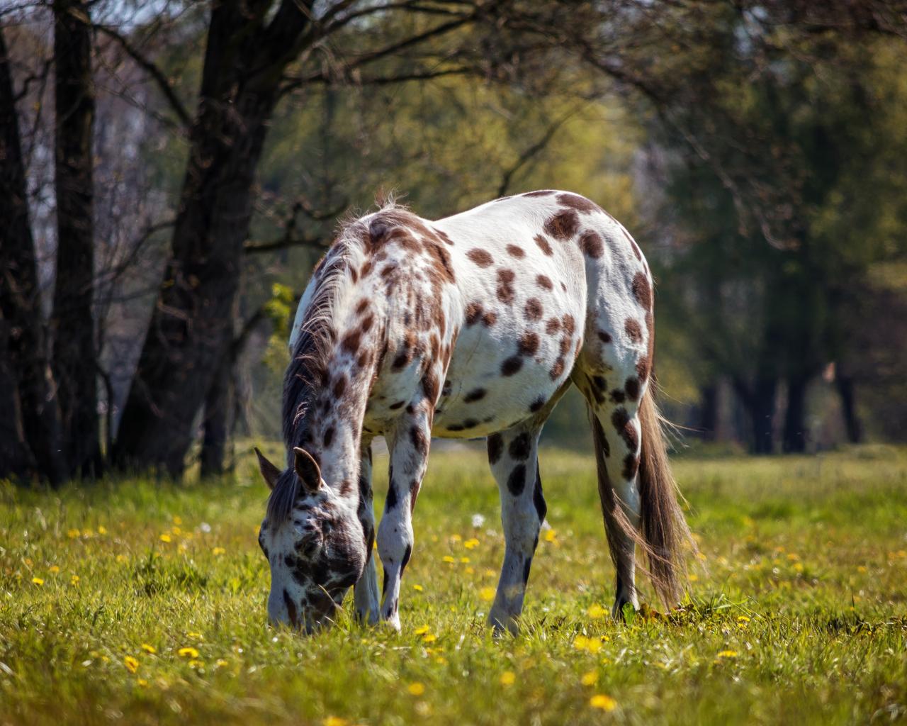 Wallpaper White spotted horse walks on green grass.