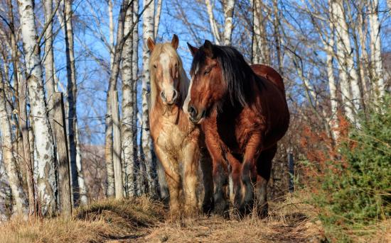 Wallpaper Two beautiful horses walk on a birch grove