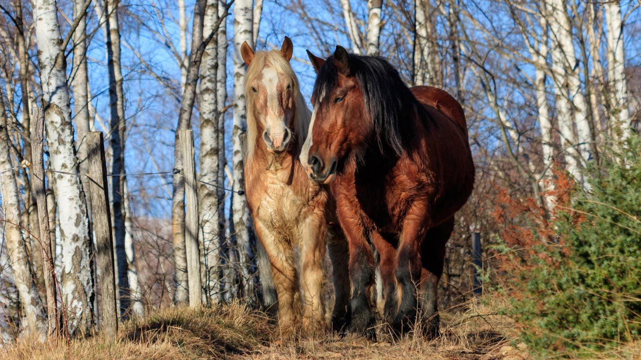 Wallpaper Two beautiful horses walk on a birch grove