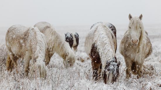 Wallpaper Snow-covered horses with graze on a winter field