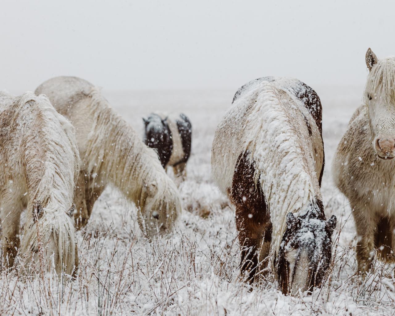 Wallpaper Snow-covered horses with graze on a winter field