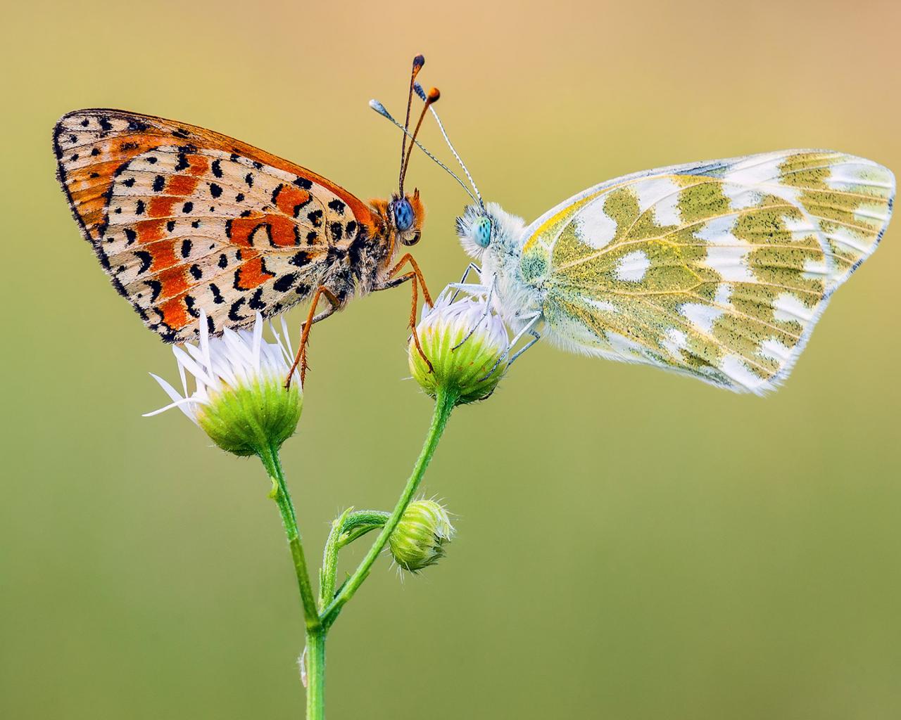 Wallpaper Two beautiful multicolored butterflies on a flower
