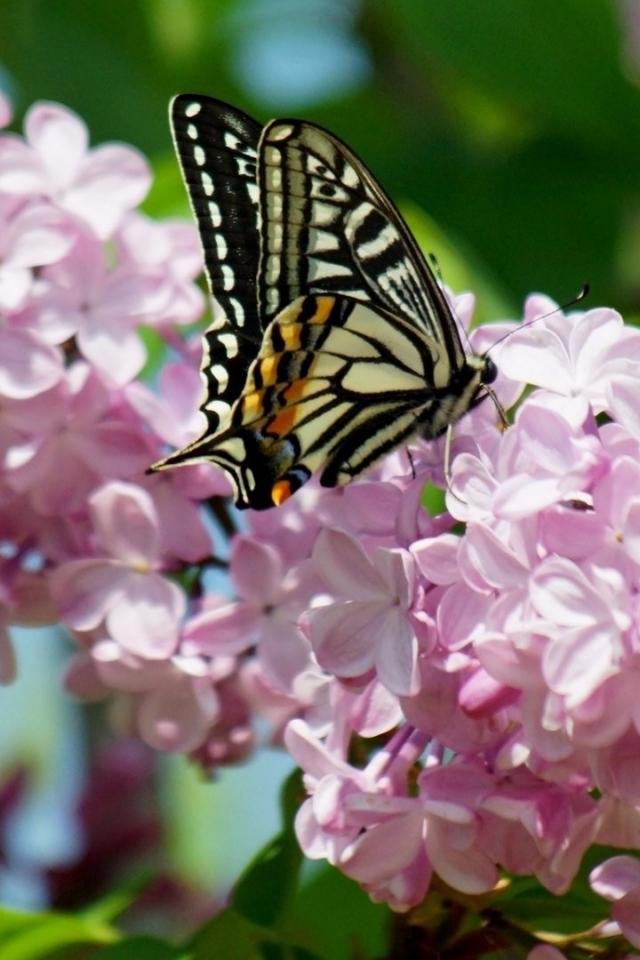 Wallpaper Butterfly machaon on a branch of a pink lilac