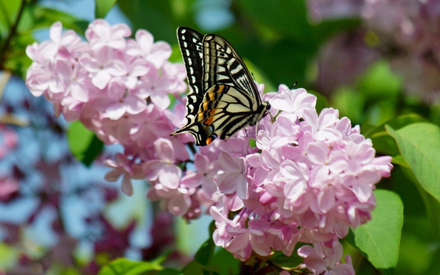 Wallpaper Butterfly machaon on a branch of a pink lilac